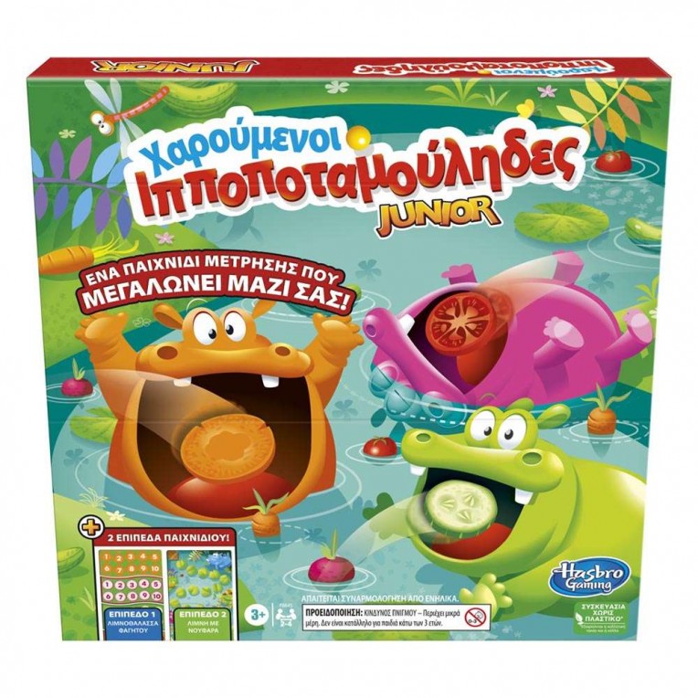 Το επιτραπέζιο παιχνίδι Χαρούμενοι Ιπποποταμούληδες Junior επιτρέπει στα παιδιά να εξασκούνται στην αναγνώριση και την καταμέτρηση αριθμών. Εμπνευσμένοι από το παιχνίδι του Skee Ball, οι παίκτες σέρνουν τα ξύλινα πικ λαχανικών μέχρι τους πεινασμένους ιπποπόταμους που περιμένουν στο Lunch Lagoon. Αυτό το επιτραπέζιο παιχνίδι για παιδιά διαθέτει 2 επίπεδα παιχνιδιού: Στο Επίπεδο 1 οι παίκτες μετρούν τη βαθμολογία τους με βάση το πού προσγειώνεται το χορτοφαγικό κουτί. Το Επίπεδο 2 χρησιμοποιεί την καταμέτρηση και την πρόσθεση, όπου οι παίκτες γλιστρούν δύο φορές και προσθέτουν τους αριθμούς για να μετακινήσουν το κουπόνι λαχανικών τους στη λίμνη. Και για τα δύο επίπεδα, ο πρώτος παίκτης που θα συγκεντρώσει 10 μάρκες λαχανικών κερδίζει το παιχνίδι. Αυτό το συναρπαστικό παιχνίδι εσωτερικού χώρου για παιδιά μαθαίνεται εύκολα, παίζεται γρήγορα και είναι ένας πραγματικά διασκεδαστικός τρόπος εξάσκησης αριθμητικής.