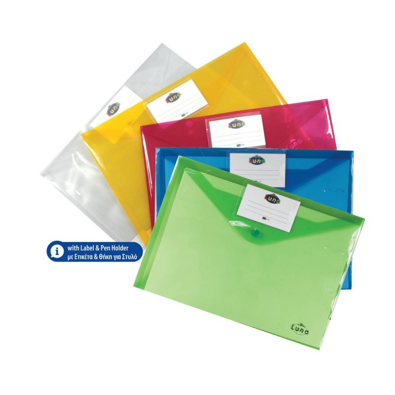 Πλαστικός φάκελος που κλείνει με κουμπί. Διαθέτει ετικέτα για τα στοιχεία του μαθητή και στη μπροστινή πλευρά θήκη για στυλό. Ιδανικό για να αποθηκεύετε και να μεταφέρετε τις σημειώσεις και τις εργασίες σας διαστάσεων Α4, στο σχολείο και το φροντιστήριο. Το απαραίτητο αξεσουάρ για τις σημειώσεις σας!