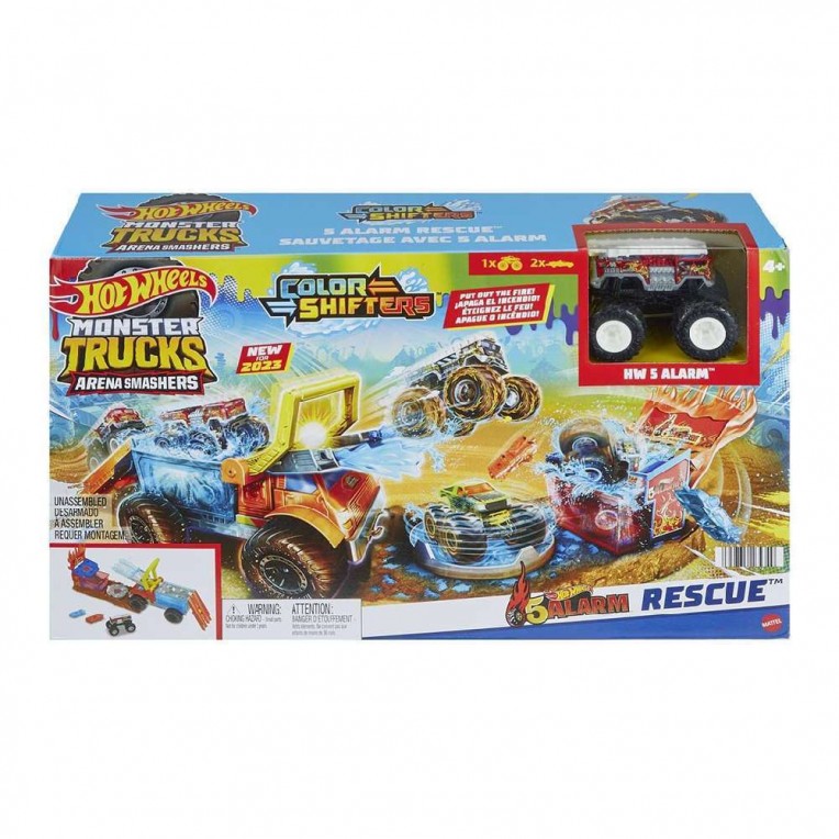Mattel Hot Wheels Σετ παιχνιδιού Χρωμοκεραυνών Monster Trucks Πυροσβεστικό. Η δράση είναι γρήγορη και το χρώμα αλλάζει εκθαμβωτικά με το σετ παιχνιδιού Hot Wheels Monster Trucks Arena Smashers 5 Alarm Rescue Color Shifters. Τα παιδιά μπορούν να οδηγήσουν το συμπεριλαμβανόμενο HW5 Alarm Color Shifters στη δεξαμενή παγωμένου νερού ενός αποσπώμενου ημι-φορτηγού για να ξεκινήσουν την πρώτη αλλαγή χρώματος πριν στοχεύσουν στις φλόγες. Χτύπησε το σημείο-στόχος και το 5Alarm πέφτει στις κερκίδες: τα δύο περιλαμβανόμενα σπαστά αυτοκίνητα και το Monster Truck πέφτουν στο ζεστό νερό και… το χρώμα αλλάζει ξανά! Κάντε μερικές περιστροφές στο spinner για να αποτινάξετε το περιττό νερό πριν επαναλάβετε την πρόκληση!